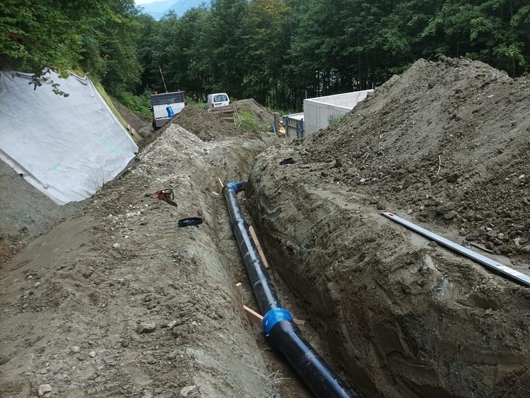 Errichtung der Druckrohrleitung über rund 1.570 lfm aus zug- und schubfesten Gussrohren DN300, bei Geländeneigungen bis zu 38°, inklusive Verlegung der Steuerkabel